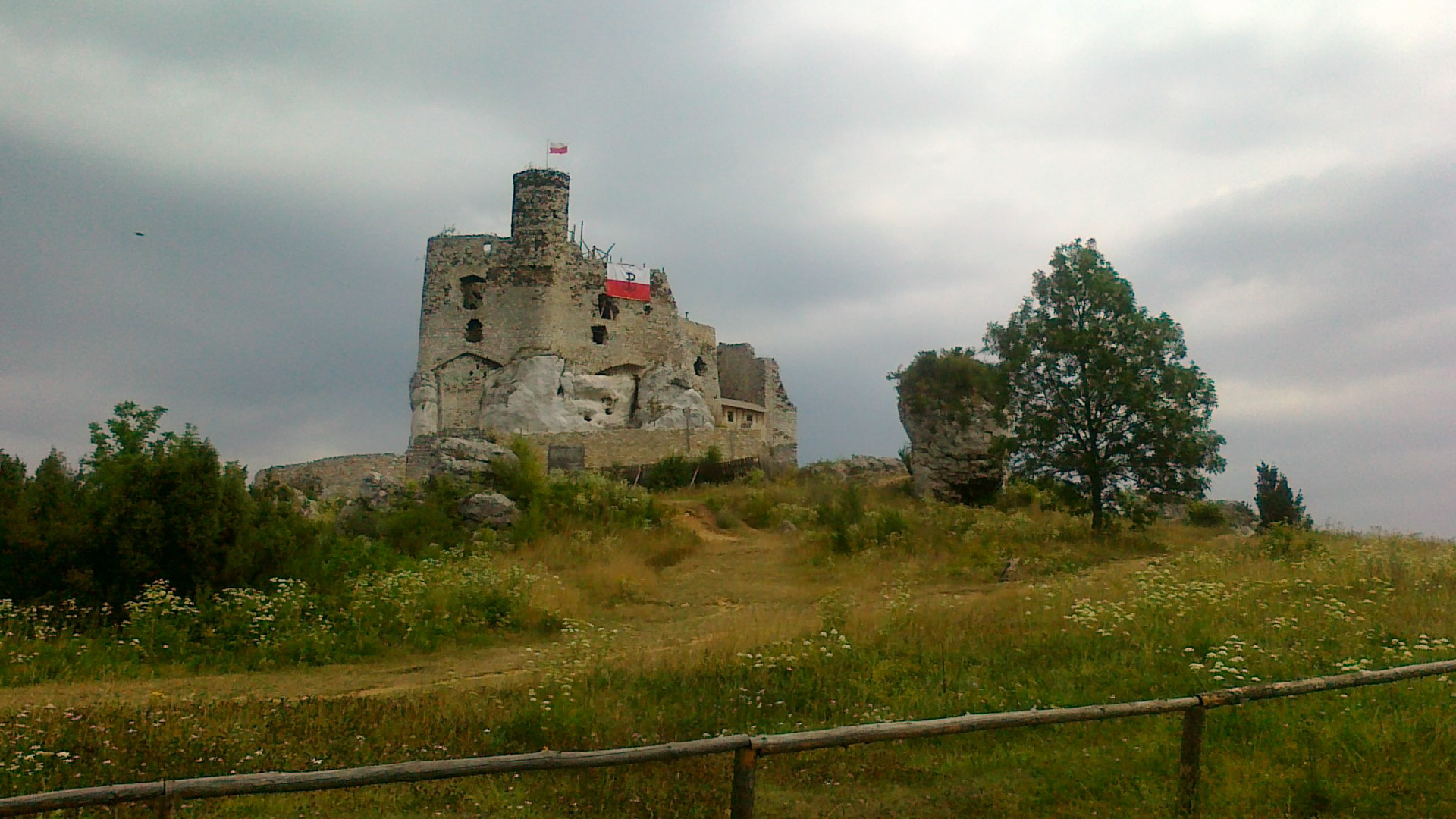 Podczas jedzenia stwierdziliśmy, że trasa jest męcząca i wymagająca, i że z lekka odzywająca się kontuzja barku wymusi na nas zmianę planów. Postanowiliśmy nieco skrócić trasę, i zamiast trzymać się czerwonego szlaku i objechać Podzamcze od północy, ruszyliśmy na południe w kierunku Ryczowa. Tam się rozdzieliliśmy – pozostali pojechali prosto do Bydlina, a ja skręciłem w kierunku Smolenia, chcąc zaliczać jeszcze tamtejszy zamek. Jechałem przez Złożeniec, gdzie wróciłem na czerwony szlak, po drodze zaliczając potężny zjazd i ciężki podjazd, na szczęście asfaltowy. Zamek w zasadzie nie zachwycił, co prawda dziedziniec był otwarty, ale do korytarzy czy komnat wejść się nie dało, co najwyżej powędrować po murze. Spędziłem tam niewiele czasu, robiąc tylko kilka zdjęć, tym bardziej że robiło się ciemno, a ja byłem tylko z mapą papierową.