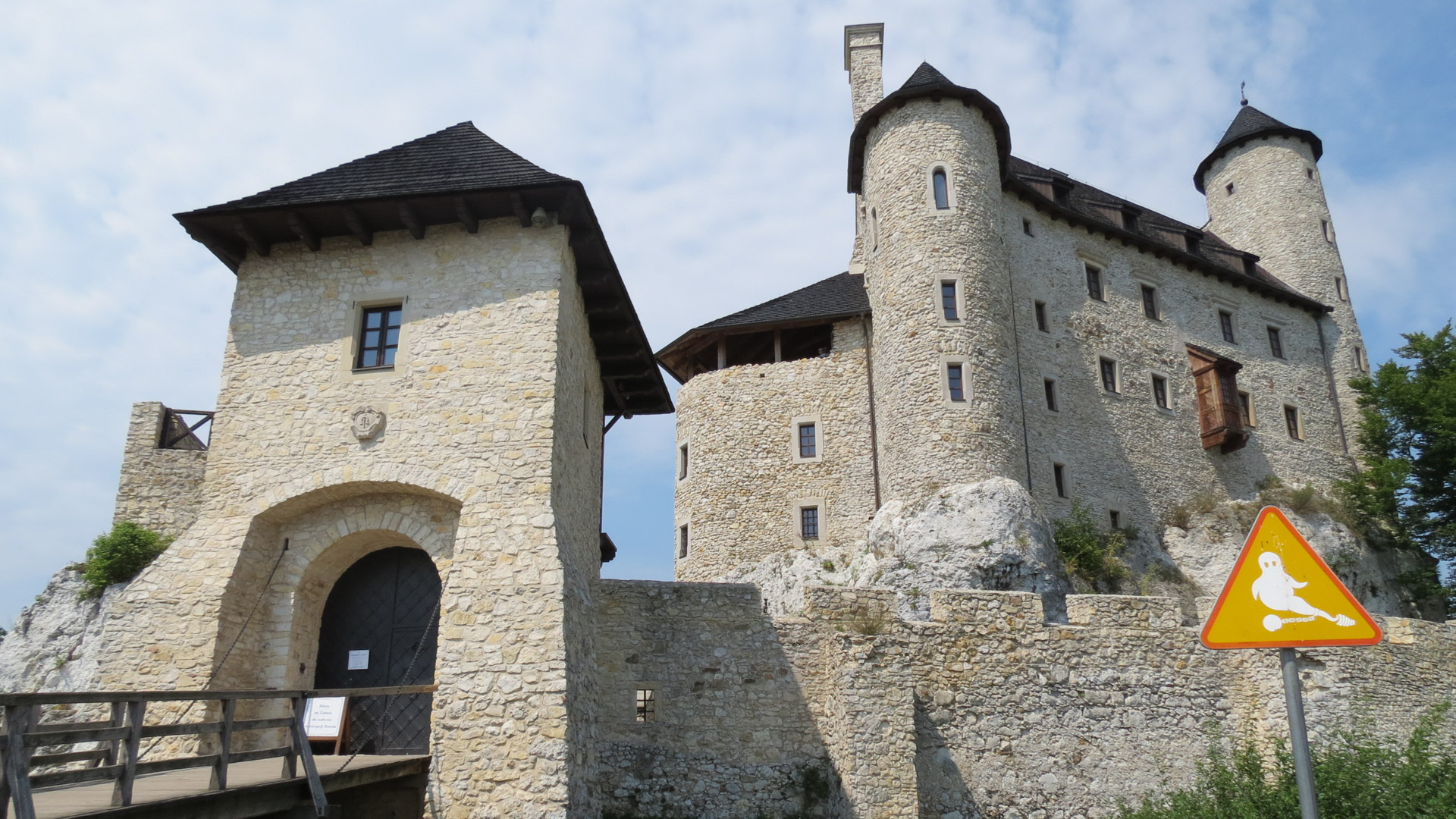 Kolejny dzień był rowerowo prosty (niespełna 20km) – przez Sąspów zajechaliśmy do Pieskowej Skały. Zjazd między tymi miejscowościami jest szalony, jadąc wąską asfaltową drogą trzeba było ciągle mieć rękę na hamulcu i być gotowym na nagłe hamowanie, zwłaszcza na końcówce. Zamek w Pieskowej Skale prezentuje się ładnie, ale turystycznie wiele nie oferuje. Zwiedziliśmy tyle, ile się dało (raptem kilka sal), obeszliśmy dziedziniec, zjedliśmy obiad na śniadanie i porobiliśmy sporo zdjęć zamku i maczugi Herkulesa. Potem ruszyliśmy drogą wojewódzką 773 wzdłuż Prądnika w dół aż do Ojcowa, gdzie pod zamkiem (niewielkim i niedostępnym do zwiedzania) wskoczyliśmy na półtorakilometrowy podjazd do schroniska.