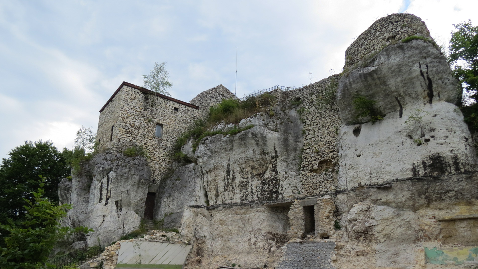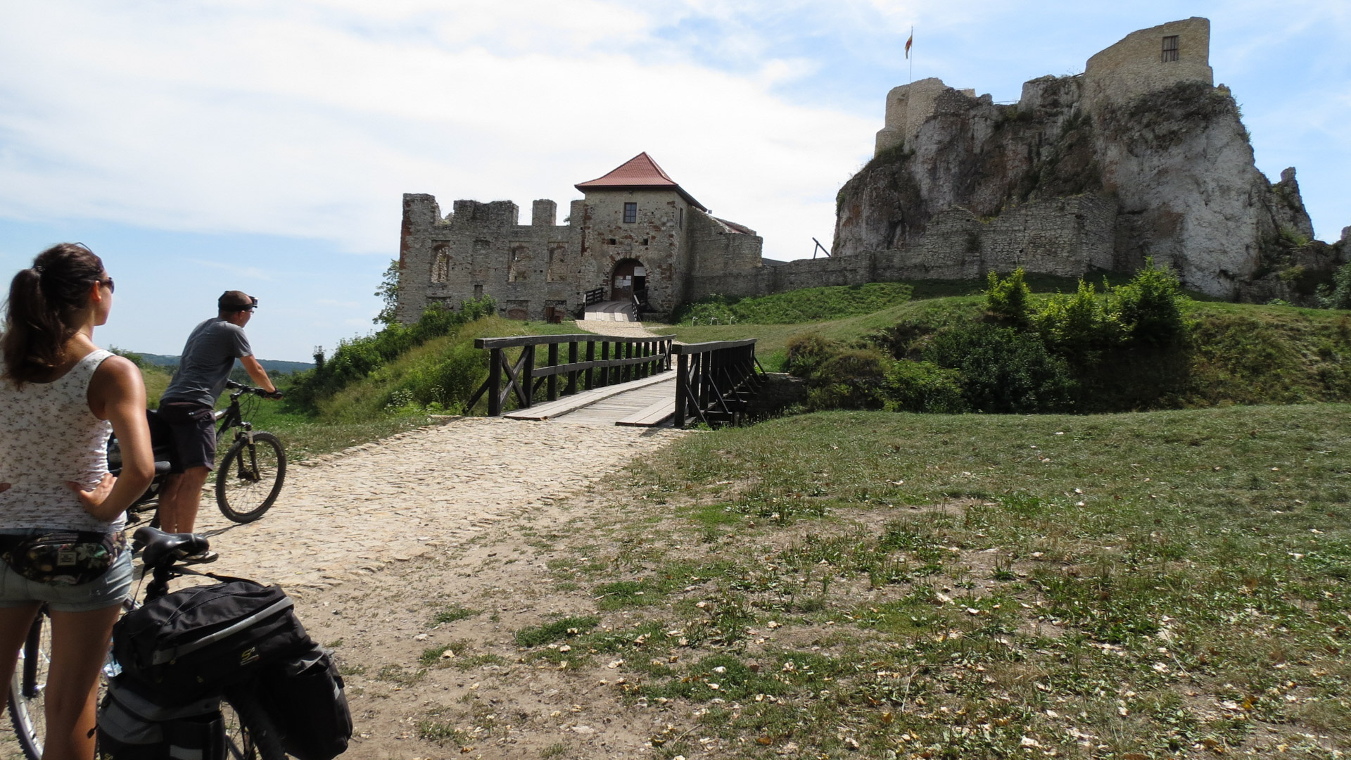 Następne kilometry mijały spokojnie, głównie lasami i polami, bez wielkich różnic wysokości, za to z długimi odcinkami mało uczęszczanymi drogami. Dopiero tuż przed Podzamczem zaczął się poważniejszy, kilkukilometrowy podjazd. Zamek w Ogrodzieńcu wynagrodził nam jednak ten trud. Tego zamku chyba nie trzeba nikomu przedstawiać. Jedna z największych twierdz polsko-śląskiego pogranicza, zachowana w formie trwałej ruiny. Znaczna część jest udostępniona turystom, dodatkowo w pobliżu jest mnóstwo sklepików, barów, restauracji itd., ogólnie więc jest tam co robić. I faktycznie spędziliśmy tam trochę czasu.