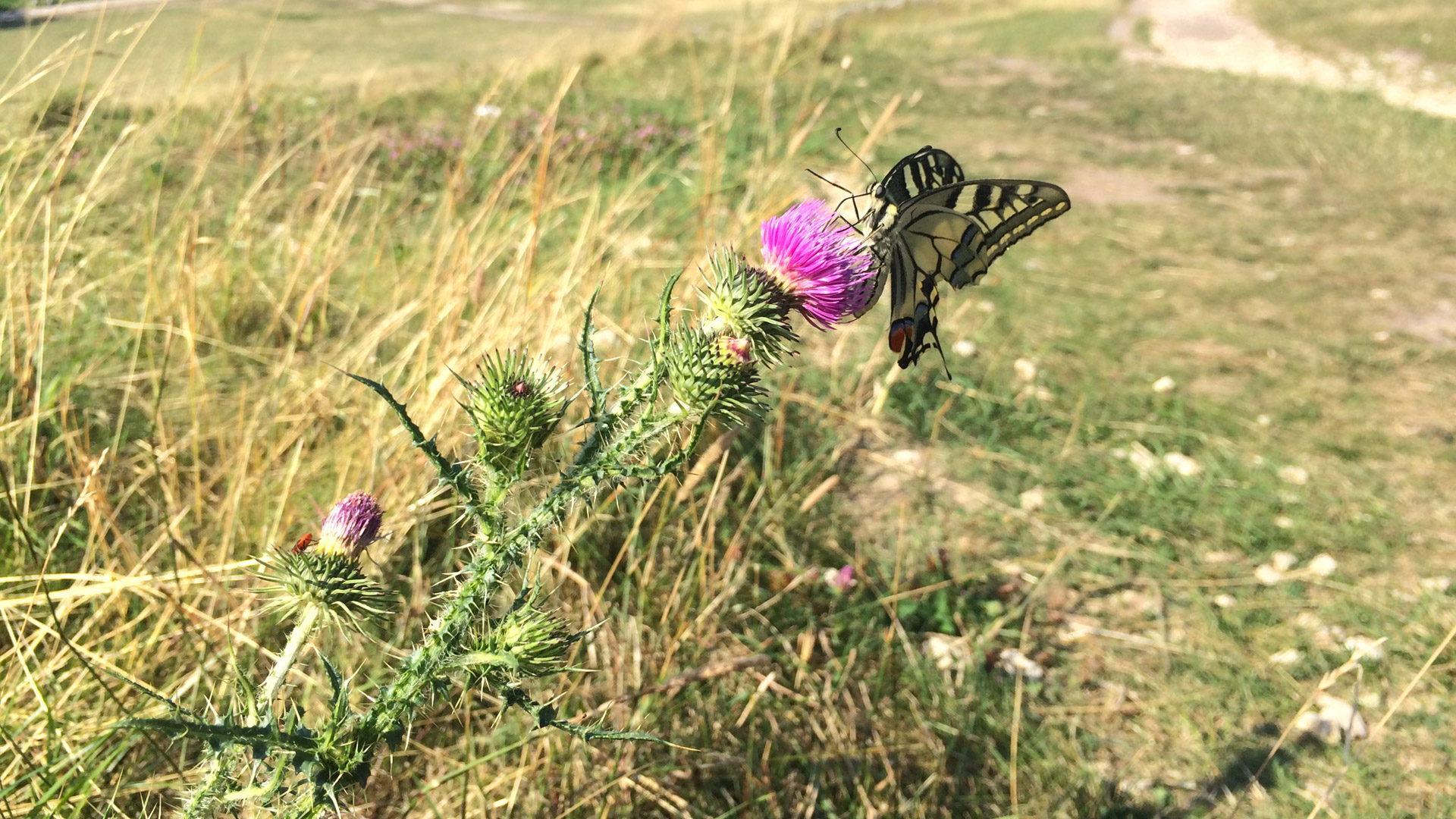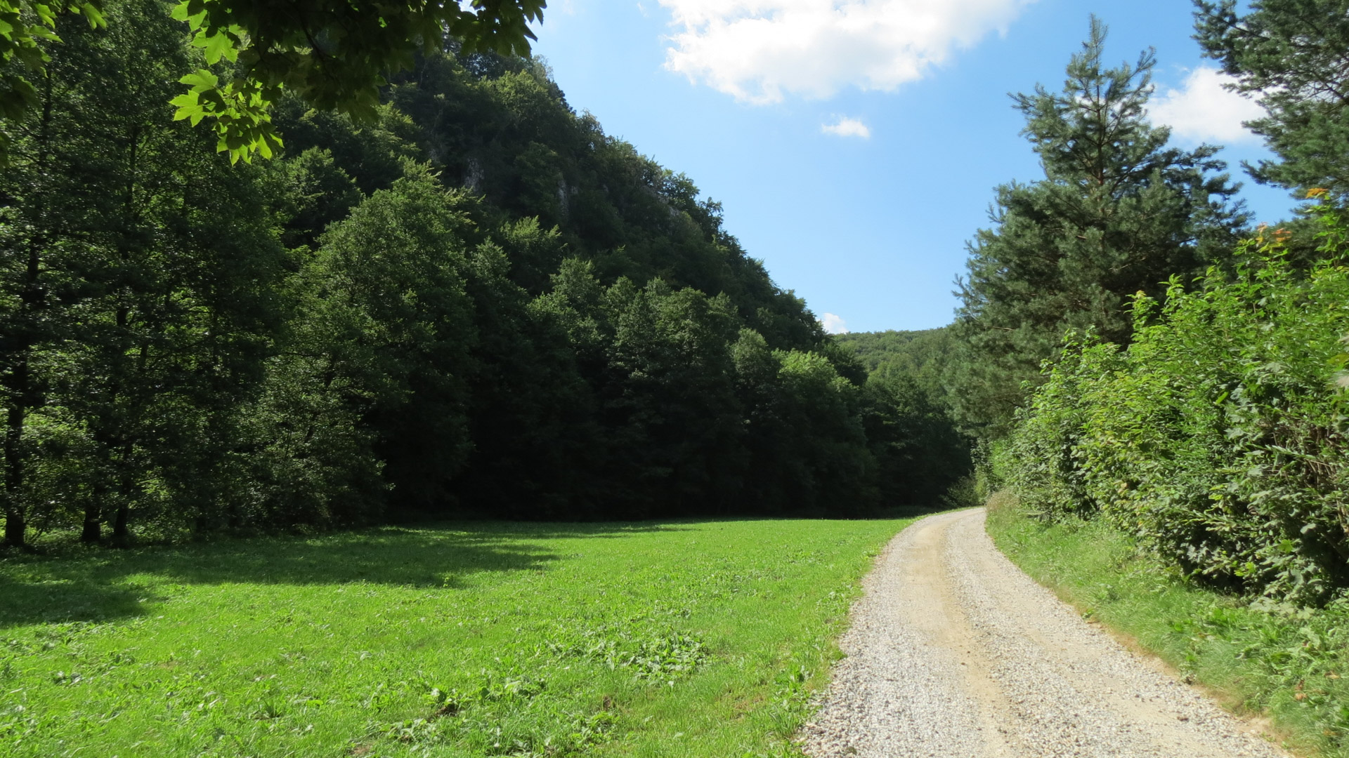 Tam przydarzyła nam się śmieszna przygoda: zgubiliśmy szlak, byliśmy wśród pól pełnych rzadkich grup drzew, gdzie nie było zasięgu. Spędziliśmy tam z pół godziny, obchodząc teren i szukając śladów szlaku, względnie szukając zasięgu. W końcu dostrzegliśmy oznakowanie – jakieś 50 metrów od miejsca, gdzie się zatrzymaliśmy… Okazało się, że na słabo widocznym rozwidleniu (jakieś 150 metrów wcześniej) zamiast pojechać prosto pojechaliśmy delikatnym łukiem w lewo. Odnalezienie się dodało nam trochę otuchy, ruszyliśmy ku Zadolu i dalej na wschód na Ojców.