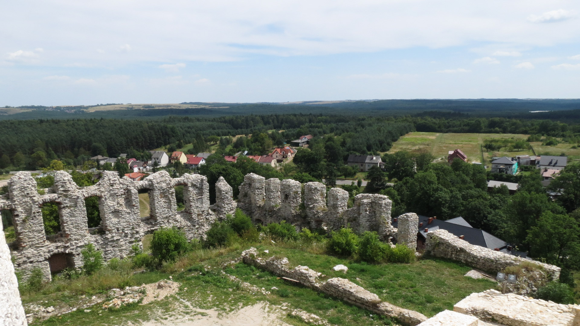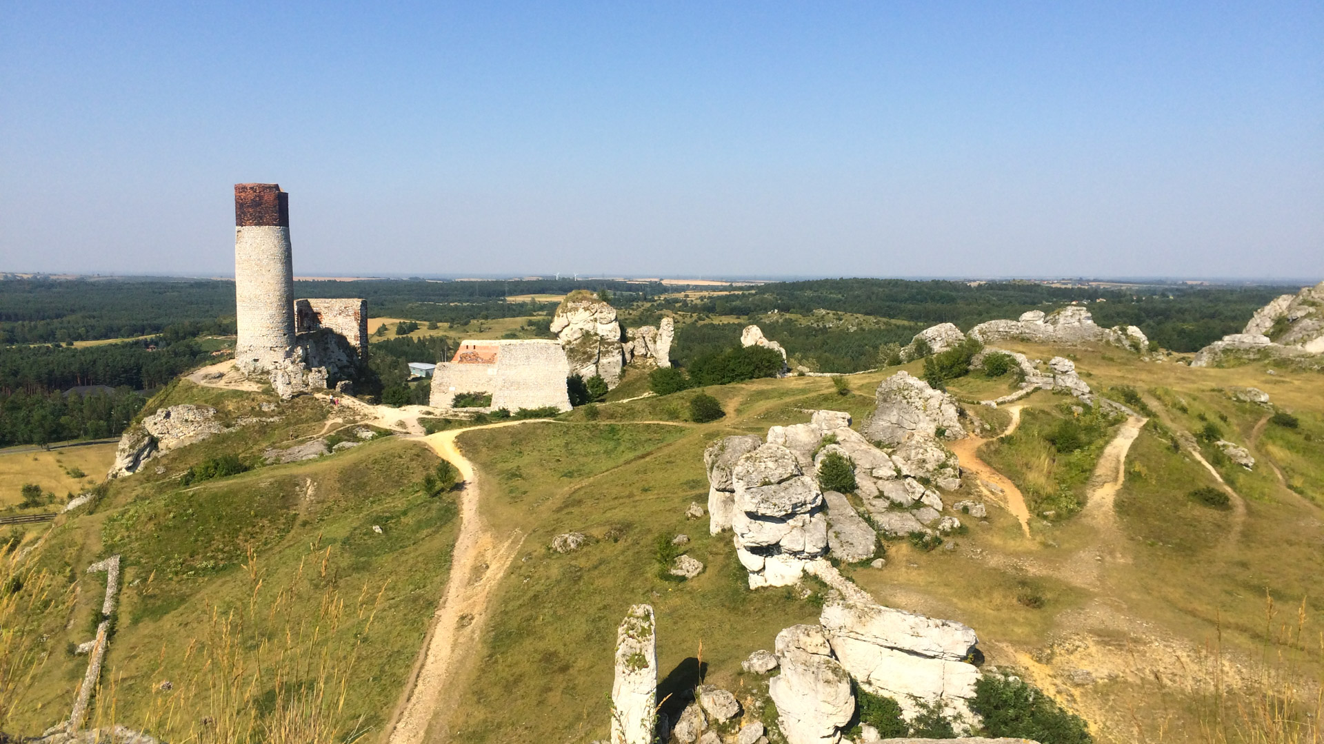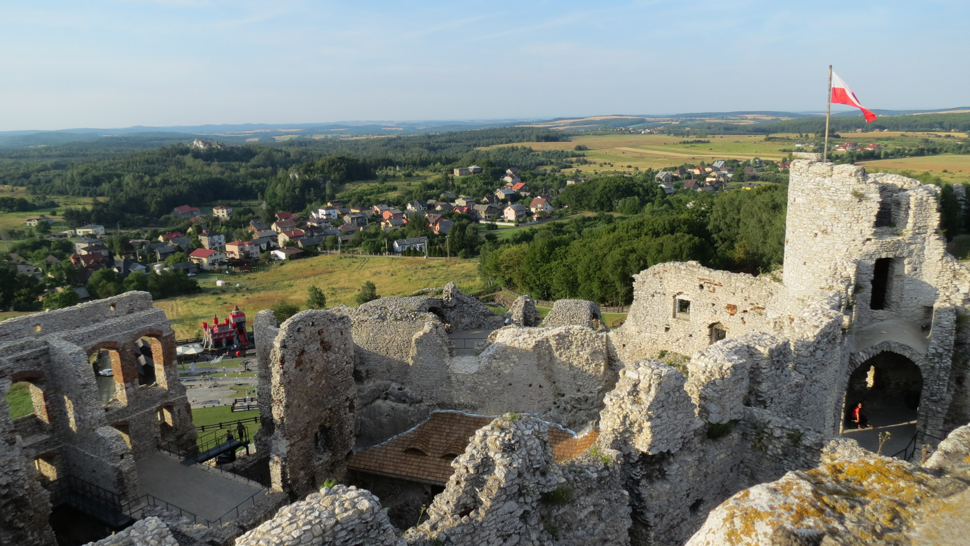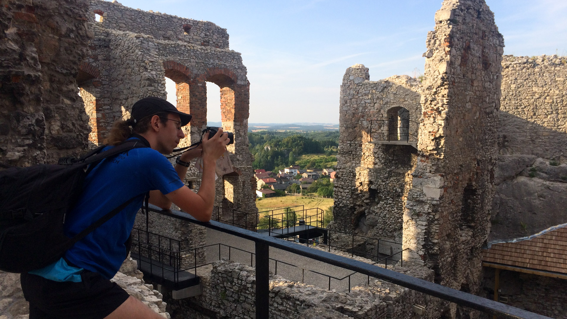 Pierwszym celem na ten dzień był zamek w Rabsztynie, od którego dzieliło nas niespełna 20km. Ruszyliśmy planowo czerwonym szlakiem, w dużej mierze przez lasy, często drogami gruntowymi i leśnymi, zaliczając kilka nieznacznych podjazdów. Rabsztyński zamek był w trakcie renowacji, ale część można było zobaczyć. Zaszliśmy też na wieżę, skąd mogliśmy podziwiać rozległą panoramę okolic. Na stokach fosy schowaliśmy się w cieniu i odpoczywaliśmy, puszczając drona.