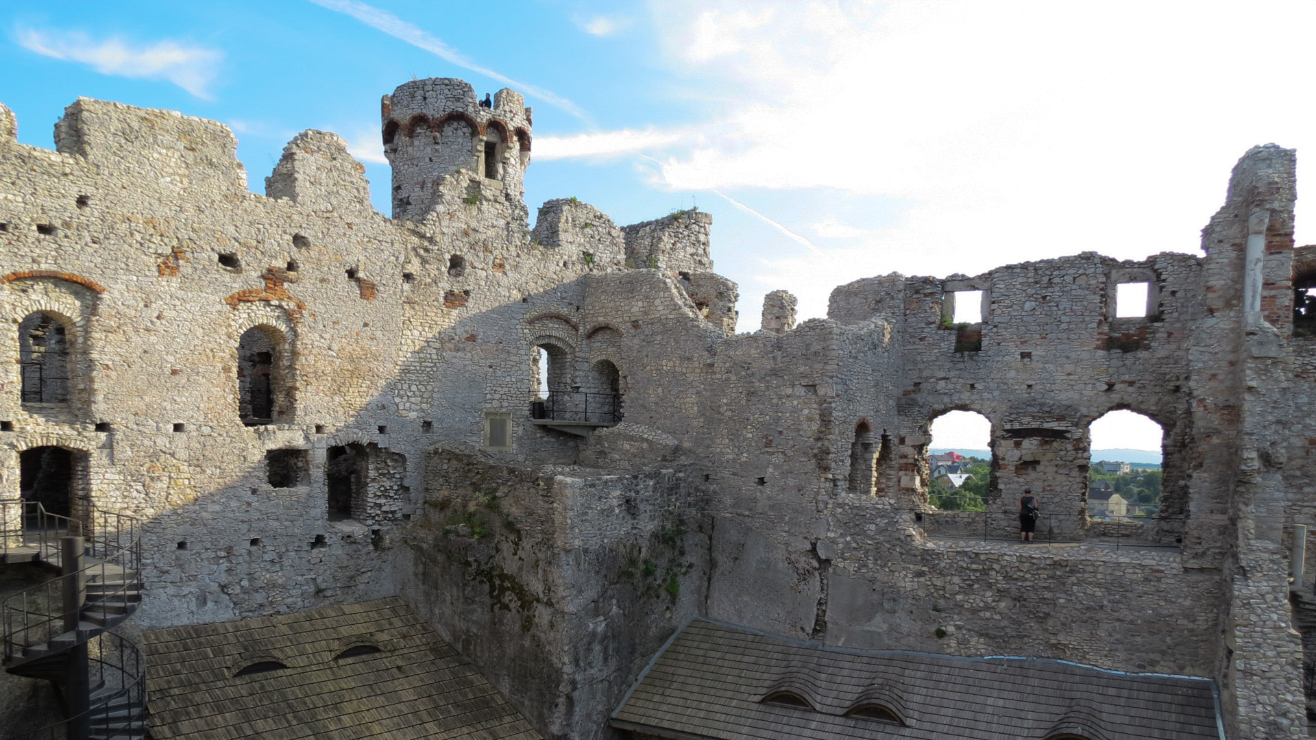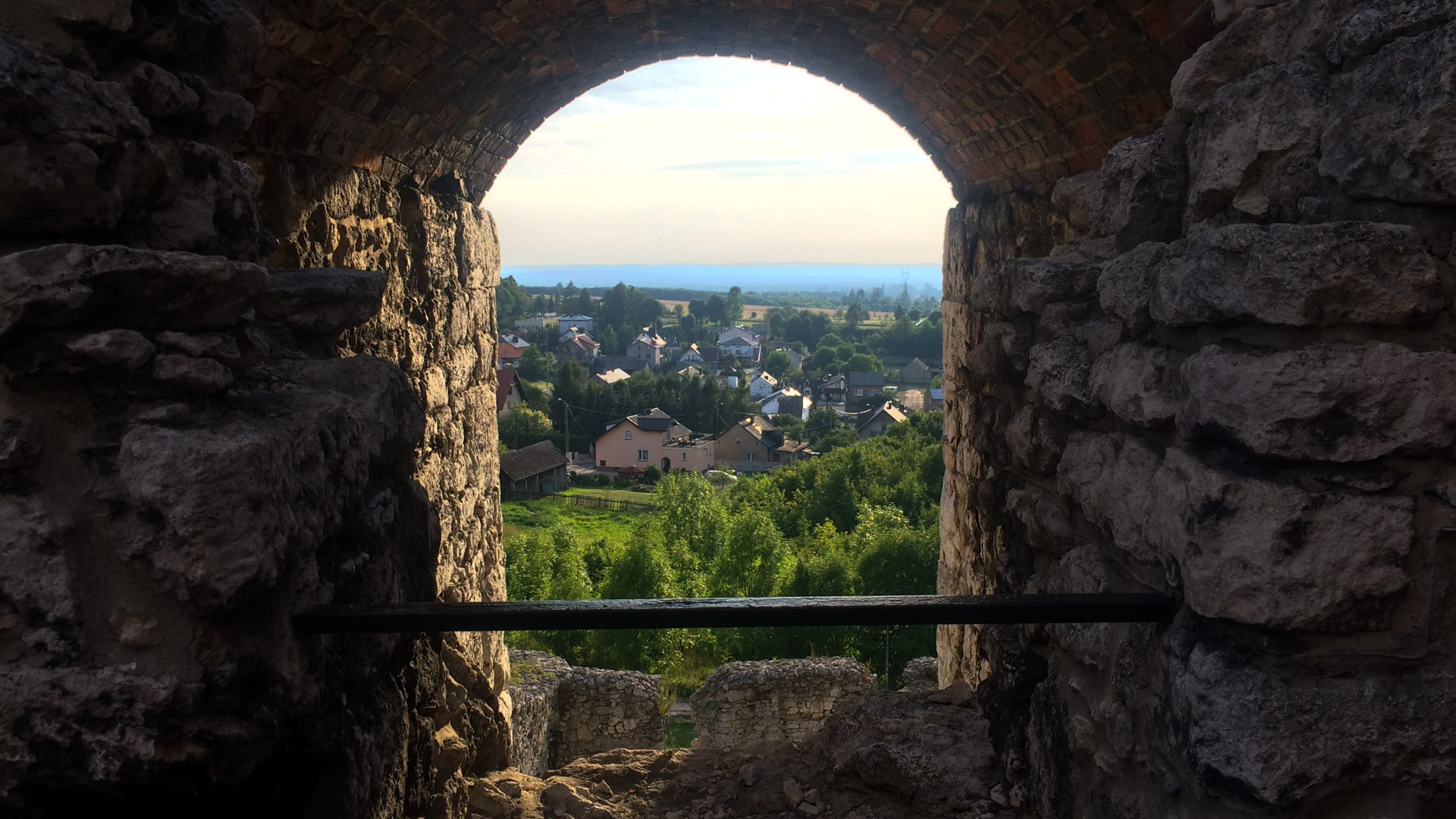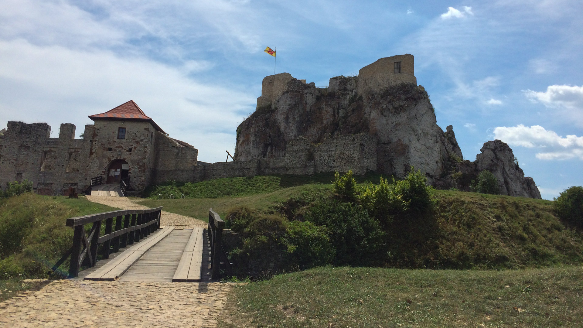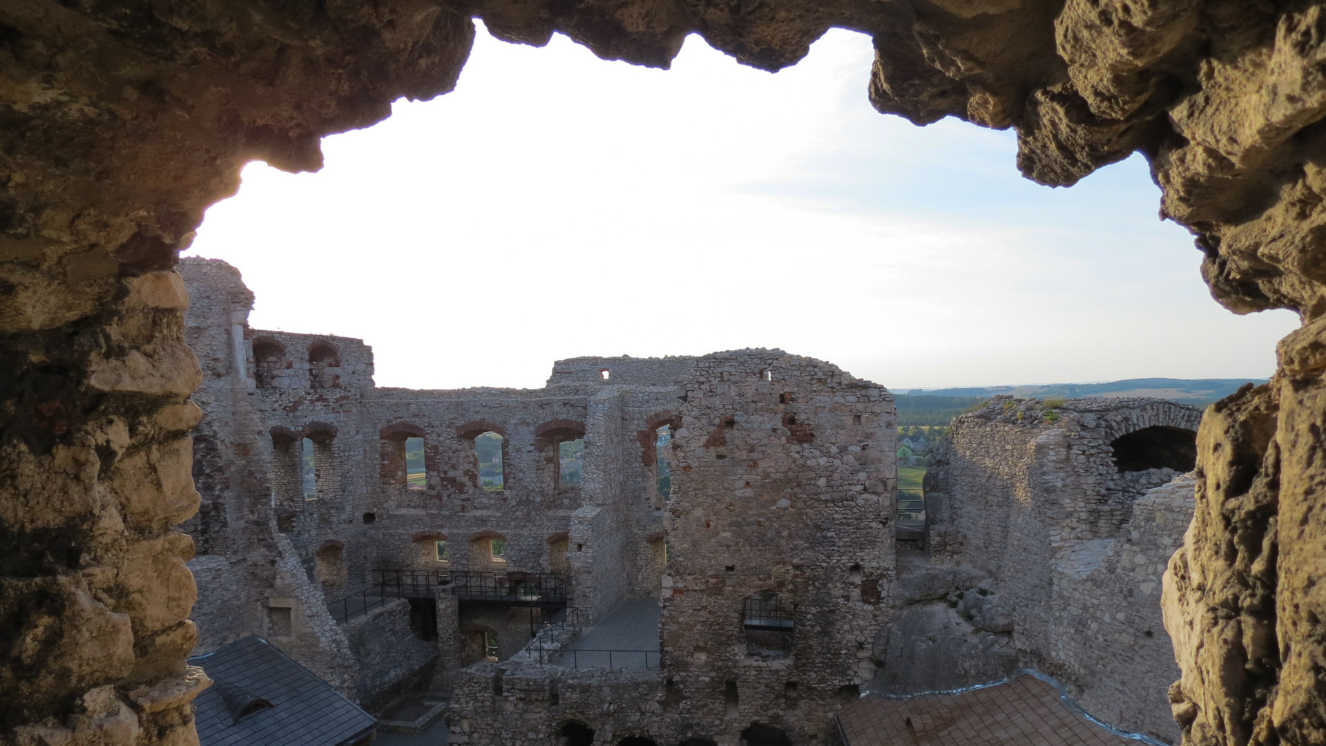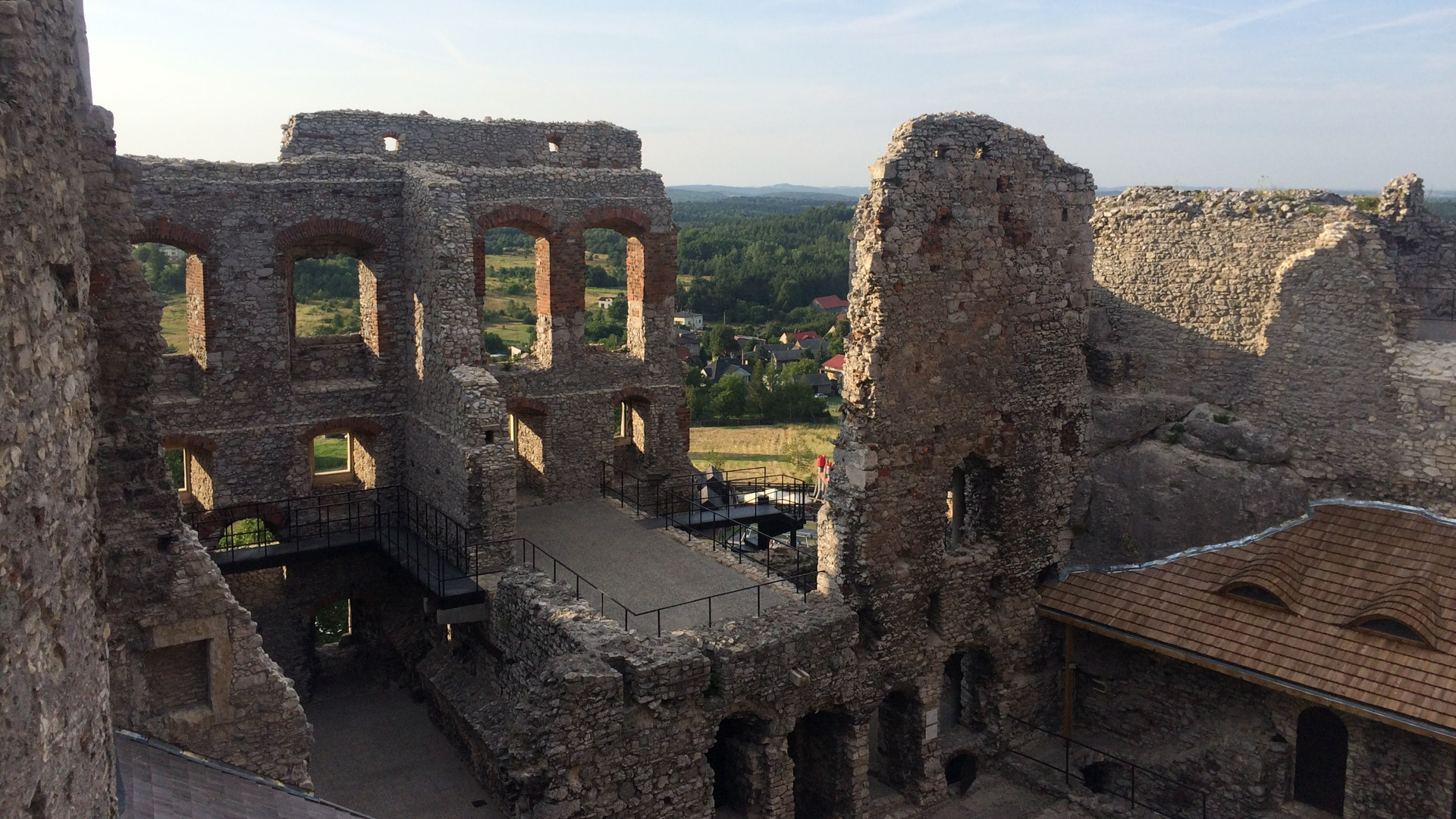 Pierwszym celem na ten dzień był zamek w Rabsztynie, od którego dzieliło nas niespełna 20km. Ruszyliśmy planowo czerwonym szlakiem, w dużej mierze przez lasy, często drogami gruntowymi i leśnymi, zaliczając kilka nieznacznych podjazdów. Rabsztyński zamek był w trakcie renowacji, ale część można było zobaczyć. Zaszliśmy też na wieżę, skąd mogliśmy podziwiać rozległą panoramę okolic. Na stokach fosy schowaliśmy się w cieniu i odpoczywaliśmy, puszczając drona.
