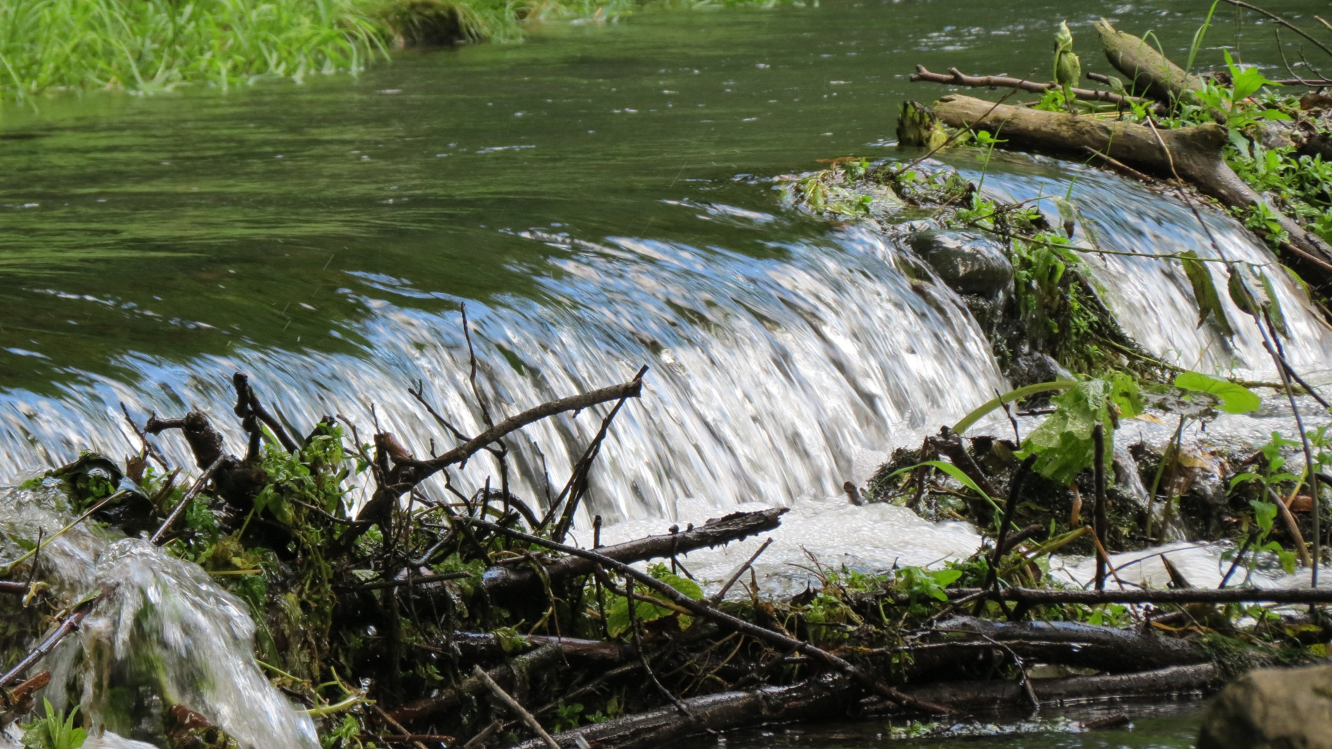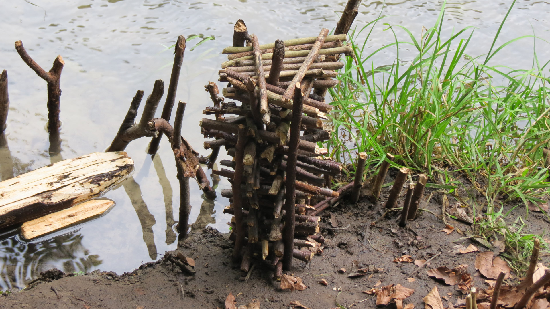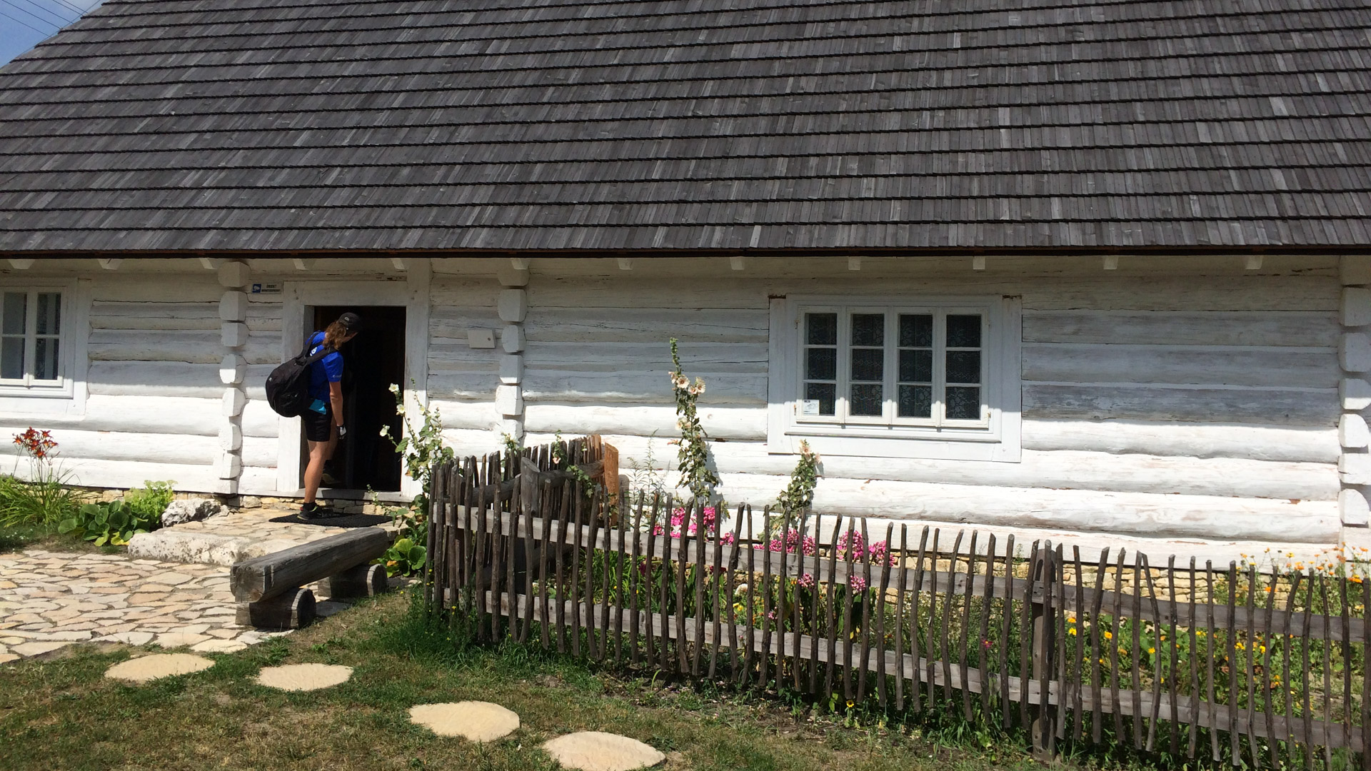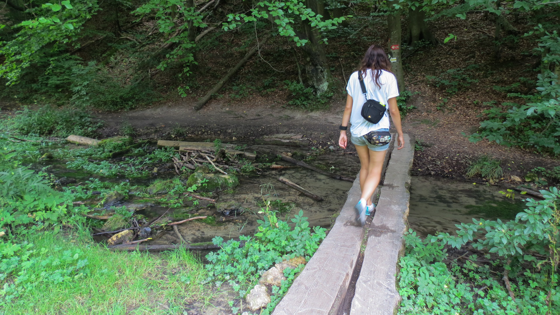 Drugą połowę dnia spędziliśmy na pieszym obejściu parku. Zielonym szlakiem zeszliśmy do Sąspówki, wzdłuż której biegnie żółty szlak do południowego krańca Ojcowa. Fragment cichy, spokojny, dość pusty, za to bardzo zielony. W jednym miejscu natknęliśmy na drewniany mini fort na brzegu rzeczki.
