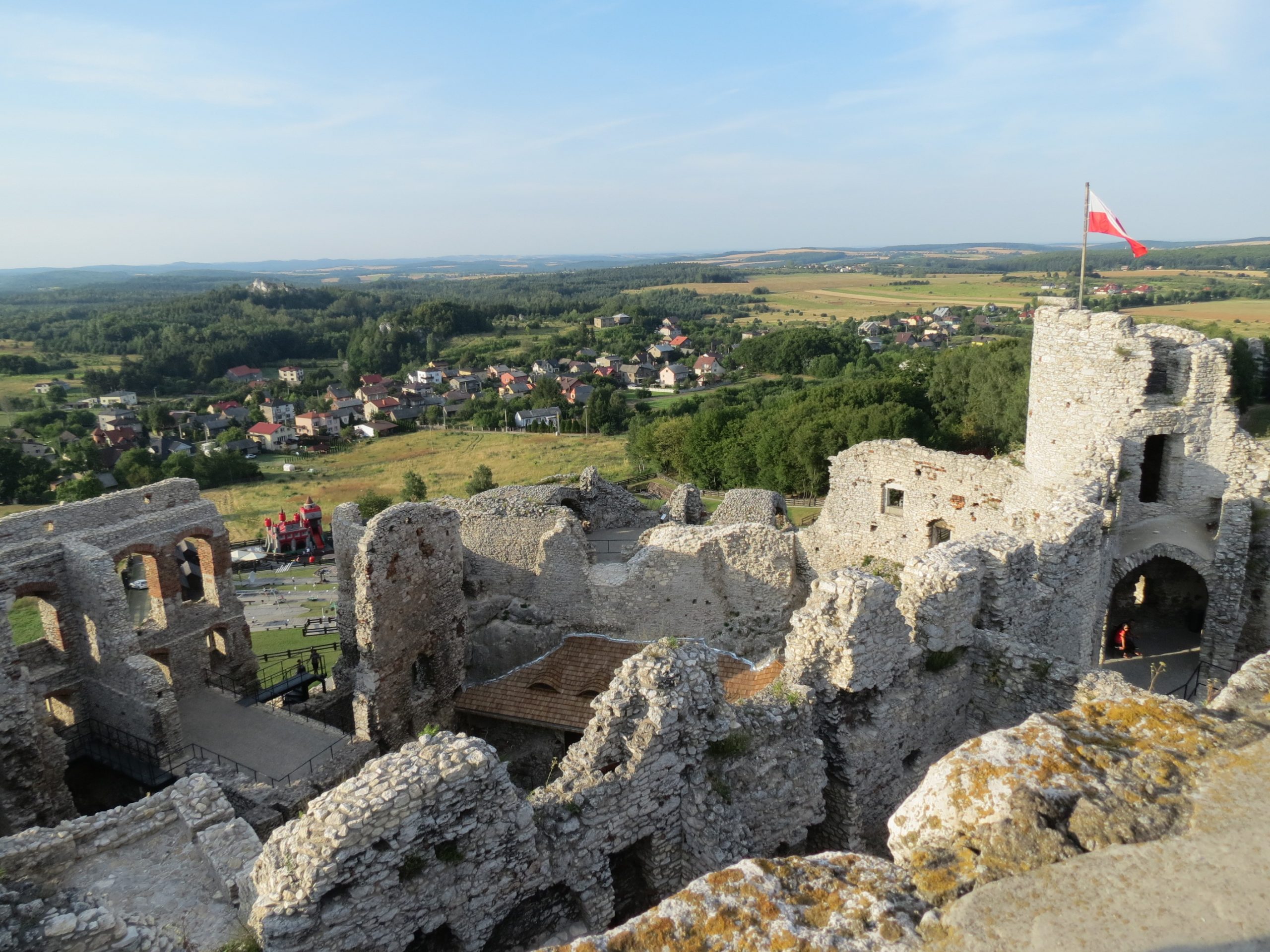 Pierwszym celem na ten dzień był zamek w Rabsztynie, od którego dzieliło nas niespełna 20km. Ruszyliśmy planowo czerwonym szlakiem, w dużej mierze przez lasy, często drogami gruntowymi i leśnymi, zaliczając kilka nieznacznych podjazdów. Rabsztyński zamek był w trakcie renowacji, ale część można było zobaczyć. Zaszliśmy też na wieżę, skąd mogliśmy podziwiać rozległą panoramę okolic. Na stokach fosy schowaliśmy się w cieniu i odpoczywaliśmy, puszczając drona.