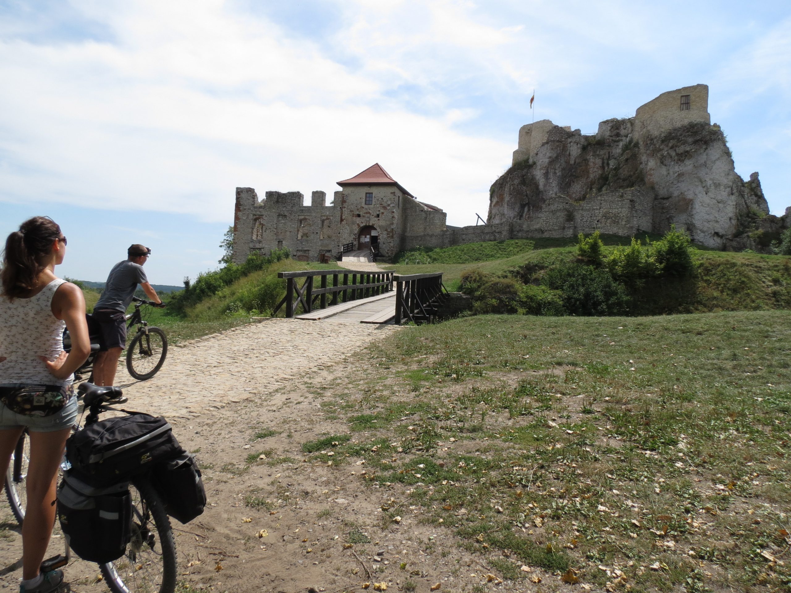 Następne kilometry mijały spokojnie, głównie lasami i polami, bez wielkich różnic wysokości, za to z długimi odcinkami mało uczęszczanymi drogami. Dopiero tuż przed Podzamczem zaczął się poważniejszy, kilkukilometrowy podjazd. Zamek w Ogrodzieńcu wynagrodził nam jednak ten trud. Tego zamku chyba nie trzeba nikomu przedstawiać. Jedna z największych twierdz polsko-śląskiego pogranicza, zachowana w formie trwałej ruiny. Znaczna część jest udostępniona turystom, dodatkowo w pobliżu jest mnóstwo sklepików, barów, restauracji itd., ogólnie więc jest tam co robić. I faktycznie spędziliśmy tam trochę czasu.