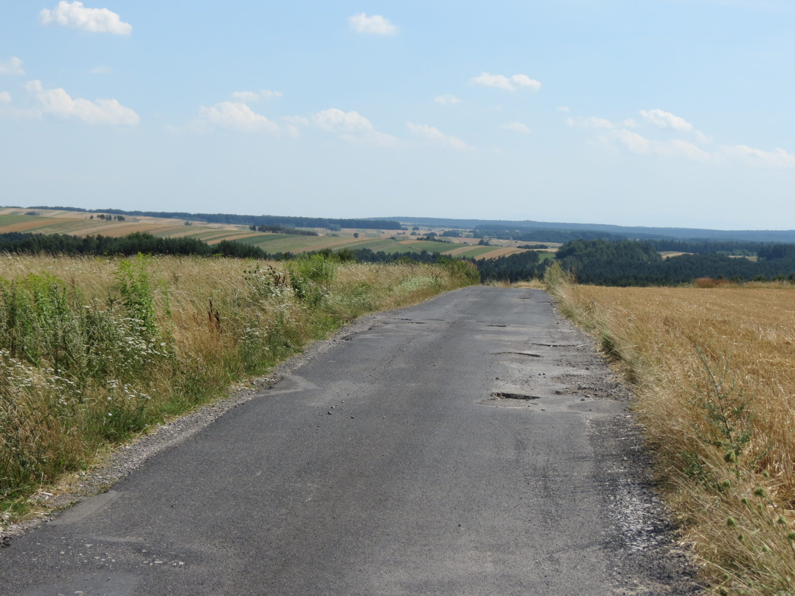 Tereny były piękne. Zdarzały się mniejsze i większe podjazdy, ale jechaliśmy głównie szlakami polnymi, czasem skrajem lasu, i to ciągnącą się łagodną granią. Dzięki temu mieliśmy piękne widoki dookoła, więc często zatrzymywaliśmy się na zdjęcia czy drona. W końcu dojechaliśmy do Gotkowic, gdzie musieliśmy uzupełnić zapasy wody. Pogoda wciąż była upalna, a ostatni odcinek wystawił nas na bezpośrednie działanie słońca (cienia niemal nie było). Po dłuższej regeneracyjnej przerwie przy sklepie ruszyliśmy na Sąspów i dalej w kierunku Ojcowa. Jechaliśmy drogą asfaltową, co jakiś czas mijały nas samochody, ale ruch nie był duży i bezpiecznie dotarliśmy do naszego noclegu (http://dwzosia.pl/), zaliczając na koniec ciekawy zjazd lasem. Łącznie zrobiliśmy ok. 45km. Wobec kontuzji postanowiliśmy spędzić w Ojcowie więcej czasu, by dać organizmowi czas na regenerację, co częściowo się udało.