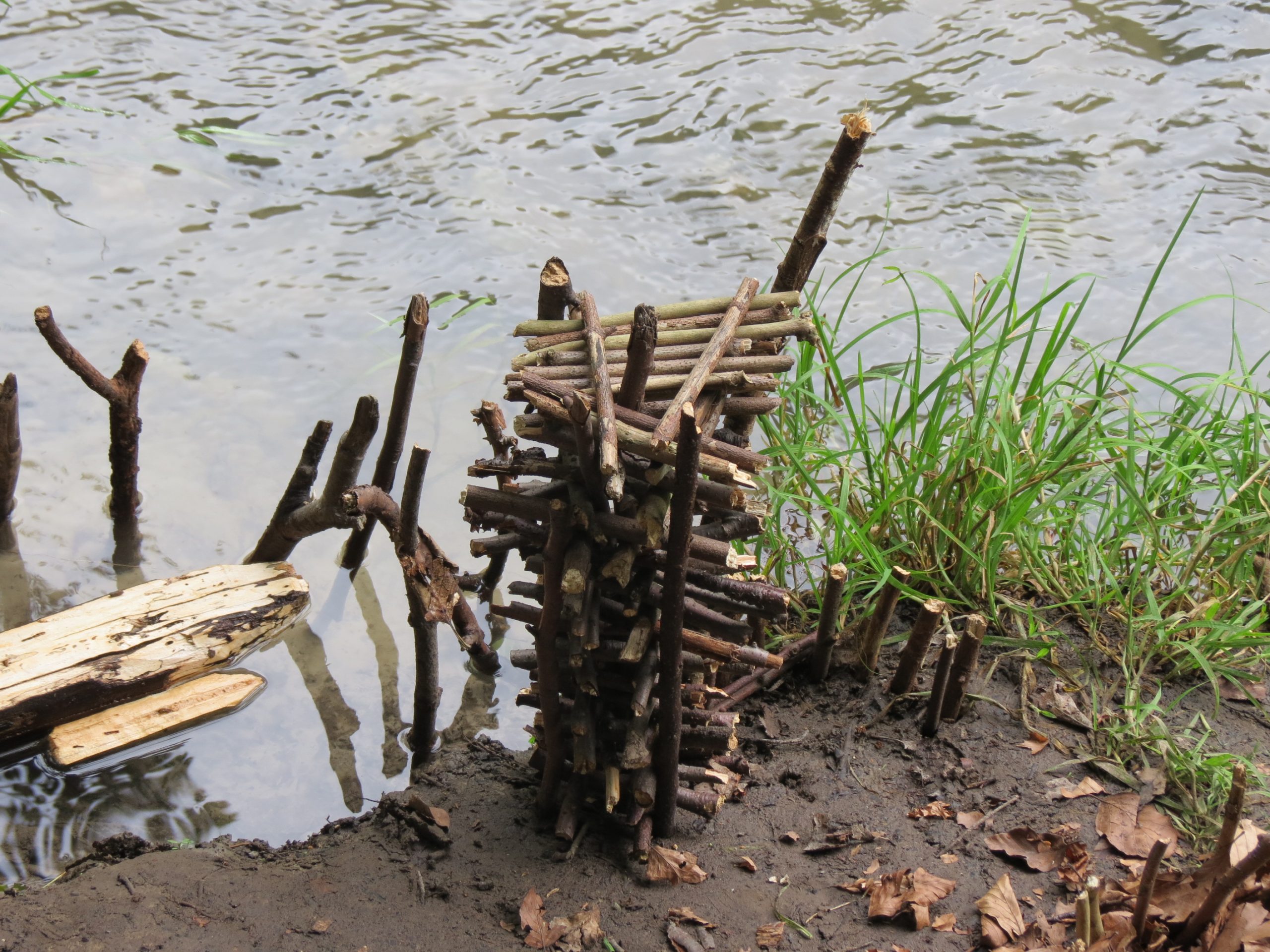 Drugą połowę dnia spędziliśmy na pieszym obejściu parku. Zielonym szlakiem zeszliśmy do Sąspówki, wzdłuż której biegnie żółty szlak do południowego krańca Ojcowa. Fragment cichy, spokojny, dość pusty, za to bardzo zielony. W jednym miejscu natknęliśmy na drewniany mini fort na brzegu rzeczki.